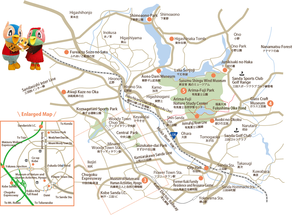 | Access | 30-minute walk from “Shin-Sanda Sta.” on JR Takarazuka Line or take a Shinki bus from Sanda Sta. or Shin-Sanda Sta. on JR Takarazuka Line, or Sanda Sta. of Kobe Electric Railway, and get off the bus at Arima-Fuji Koen-mae. The park is near the bus stop. |