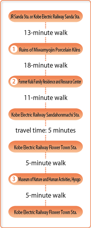 Ruins of the site of renboshiki-gama (continuous firing kiln chambers) are open to the general public as they were at the time of excavation and research. Celadon porcelain baked here was highly recognized both inside and outside Japan as “Sanda Porcelain” for the creation of elaborate molded porcelain. Also provided at this site is hands-on learning of creating ceramics. (Reservation required & there is a charge.)